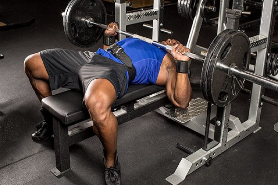 - Nằm ngửa lưng trên ghế thẳng. Hai tay nắm chặt thanh đòn ngang rộng hơn vai, nhấc thanh tay khỏi khung xà và giữ thẳng trên ngực.